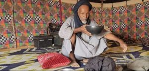 Goats and camels, belonging to the nomads freely roam around their camp . In the morning , a female member rocks camel / goat milk back and forth inside a cylindrical goat sheep skin. Soon, she places a blazing coal fire under the rocking goat skin container, enabling the milk to turn into butter or cheese or a butter milk flavour . The men take the goats and camels to graze in the morning and return to their camp late afternoon.